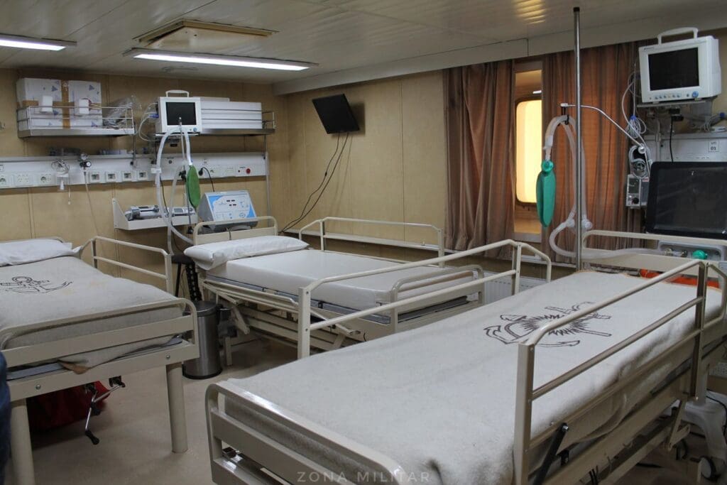 Durante el recorrido, el Teniente nos explicó las distintas unidades que posee en servicio. El piso 03 el Irízar posee una sala de terapia intensiva y cirugía para soporte básico vital con una sala de cirugía, siete camas, dos respiradores fijos, un respirador portátil, dos desfibriladores, electrobisturí, mesa de anestesia y telemedicina, entre otros elementos.