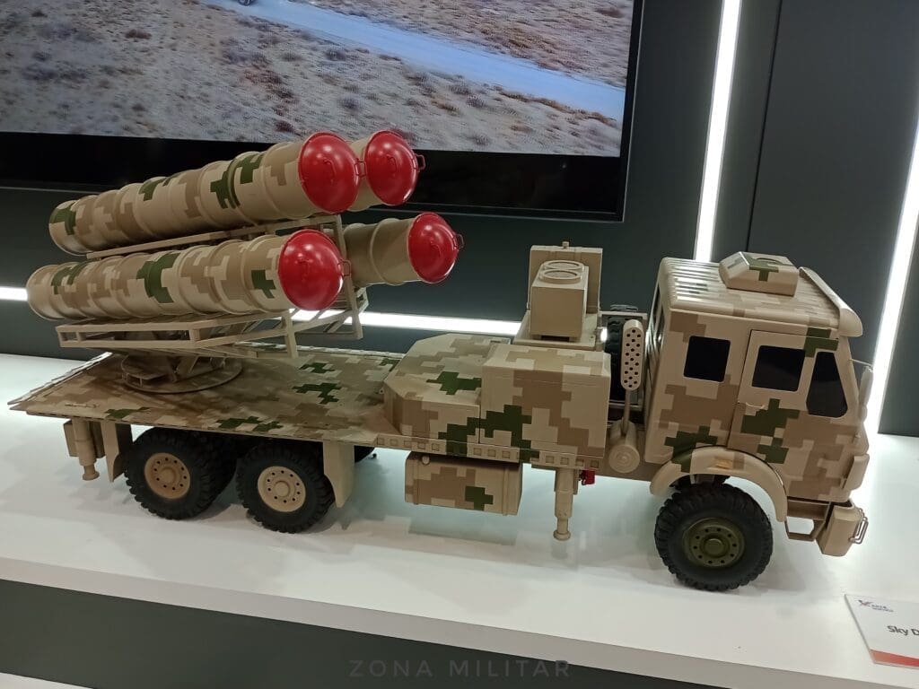 “Los productos antiaéreos que te mostramos incluyen dos tipos o dos formas o situaciones de uso, uno para defensa de un campo fijo y otro de defensa antiaérea de acompañamiento. Para el de campo fijo tenemos el sistema de Sky Dragon que ya es una familia, porque cuenta con un lanzador o un vehículo lanzador y pueden utilizar los diferentes misiles de diferentes alcances incluyendo de 30, de 50, y de 100 km. Y el otro tipo es de acompañamiento, tenemos varios vehículos para este misil antiaéreo en blindados de 8 x 8 o 6 x 6, y lleva misiles con alcance de 20 km. Además, también tenemos nuestro sistema antiaéreo para los drones, contamos con este sistema de destrucción por láser y también con sus potencias ajustables para enfrentar diferentes amenazas de drones.”
