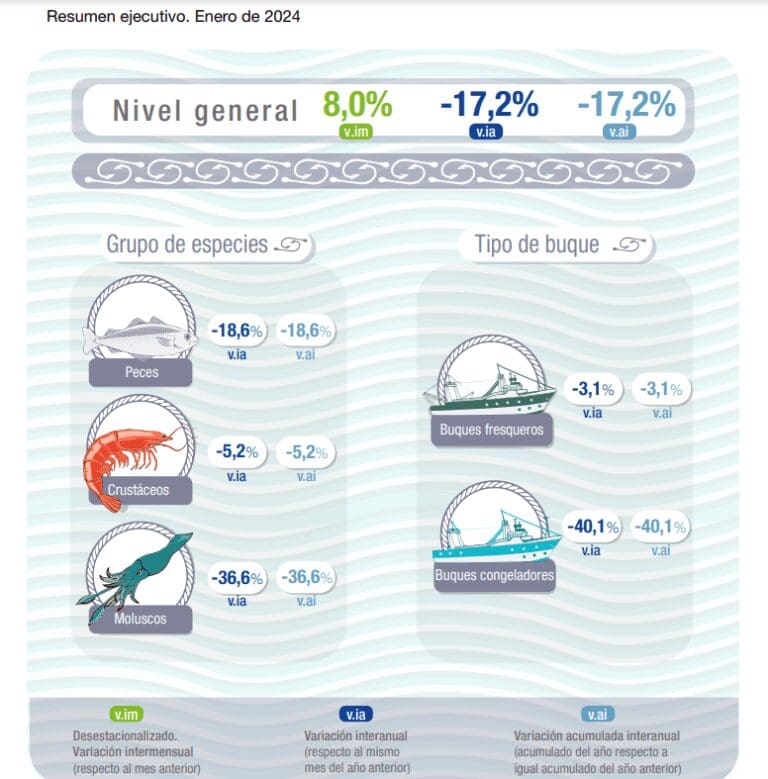 En lo que respecta al tipo de buque, los desembarques realizados por los “Buques fresqueros” en enero de 2024 disminuyeron un 3,1% en comparación con el mismo mes del año anterior, con una incidencia negativa del 1,9% en la variación interanual del índice. Por otro lado, los desembarques realizados por los “Buques congeladores” mostraron una caída más pronunciada, alcanzando el 40,1%, con una incidencia negativa del 15,3%.