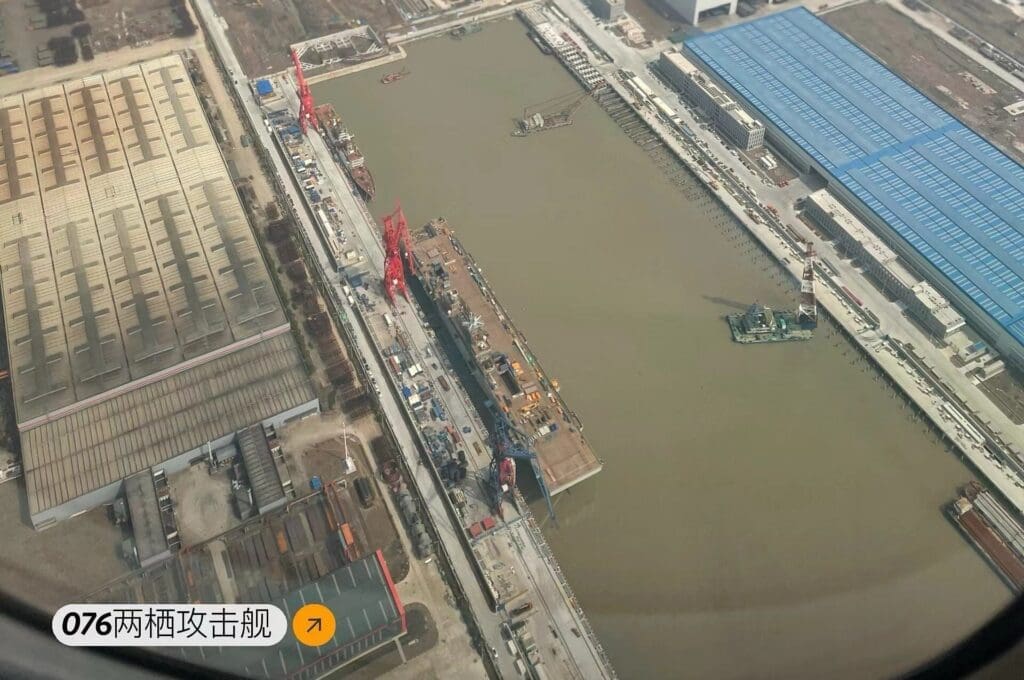 En las últimas horas, se ha dado a conocer los avances en los trabájanos de finalización del nuevo y cuarto Buque de Asalto Anfibio LHD Tipo 075 de la Armada del Ejército Popular de China (PLAN), gracias a una serie de imágenes publicadas en Fuentes de Información abierta (OSINT) en redes sociales. Según las fotografías aéreas tomadas y publicadas por usuarios de las red social X, se pudo apreciar una fotografía cenital del Buque de Asalto Anfibio mientras se encuentra en construcción en el astillero Hudong-Zhonghua, listándose detalles de los trabajos de finalización.