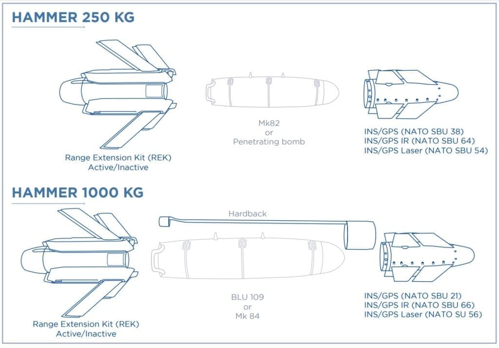 En cuanto al kit de guiado AASM (Armement Air-Sol Modulaire; Armamento Aire-Suelo Modular), también conocido como HAMMER (Highly Agile Modular Munition Extended Range), sus ventajas se sostienen en las diversas opciones que ofrece para sus sistema de guía (INS/GPS, INS/GPS IR e INS/GPS Láser), así como en la capacidad de extender considerablemente la capacidad stand-off, facilitando que la aeronave lanzadora opere por fuera del alcance de algunos sistemas de defensa antiaérea.