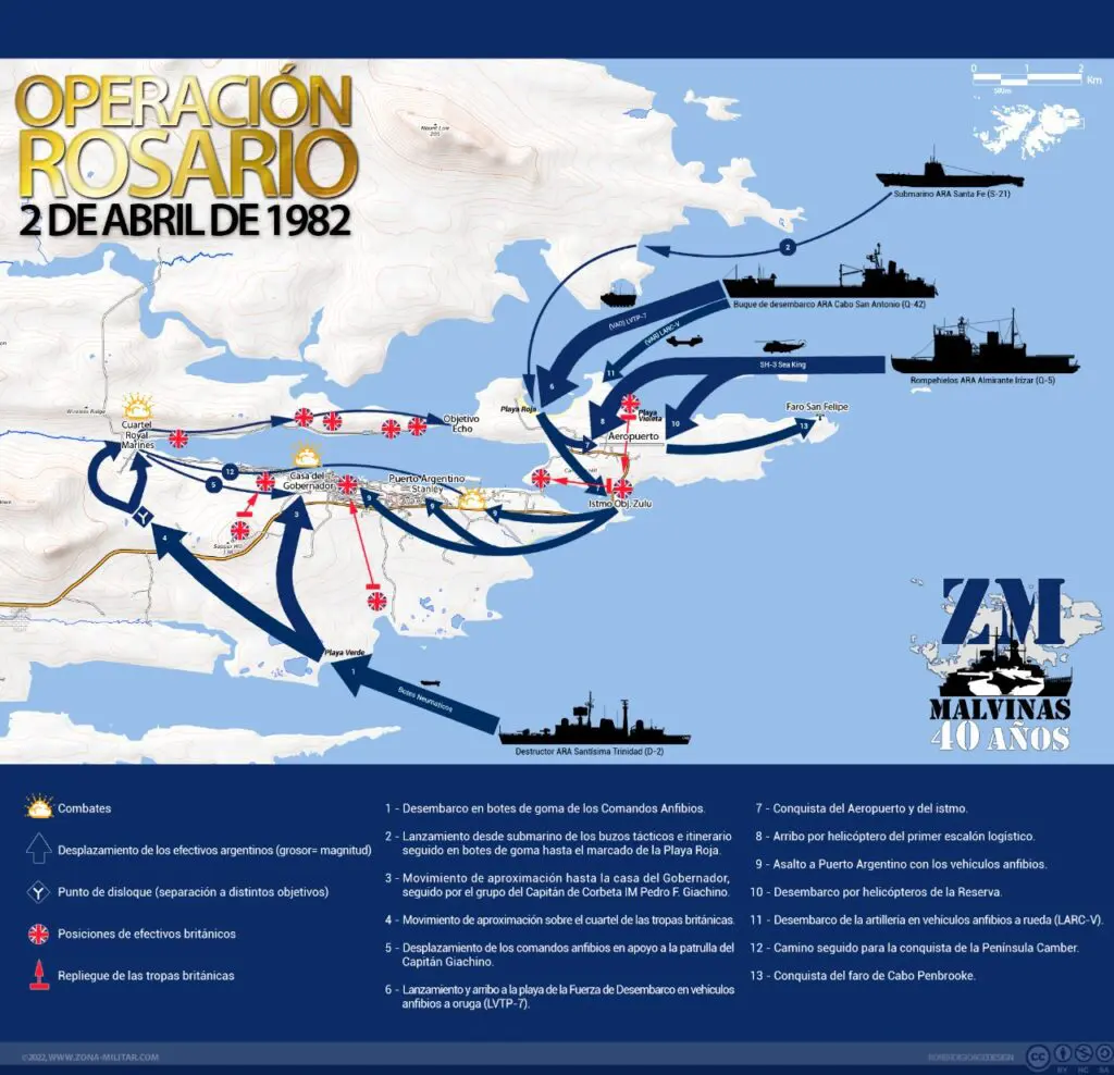 Los primeros efectivos argentinos en pisar la turba malvinense fueron los integrante de la Agrupación Comandos Anfibios de la Infantería de Marina y la Agrupación Buzos Tácticos de la Armada. Aproximadamente a las 21:30, el destructor ARA Santísima Trinidad fondeó a 1 milla sur de la costa de la Isla Soledad. Desde esa posición, las tropas de operaciones especiales argentinas desplegaron 21 botes tipo Zodiac hacía su localización designada.