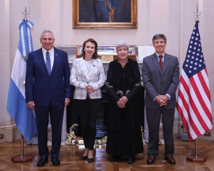 La canciller argentina, Diana Mondino, recibió el martes a una delegación de Estados Unidos integrada por la subsecretaria de Comercio Internacional del Departamento de Comercio, Marisa Lago, y el embajador Kevin Sullivan, subsecretario de Estado Adjunto para Brasil, el Cono Sur y Asuntos de la Región Andina del Departamento de Estado. Esta reunión se enmarca dentro de los esfuerzos para fortalecer los lazos bilaterales entre ambos países.
