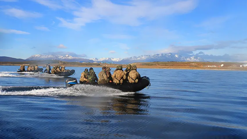 Luego, se trasladaron al hangar de la Estación Aeronaval Ushuaia, donde abordaron el helicóptero Sea King con destino al RHAI, que estaba anclado en la Bahía Ushuaia. Después de completar el transporte en helicóptero, descendieron a botes tipo “Zodiac” desde el barco y realizaron formaciones hasta llegar a la playa, concluyendo así la actividad.