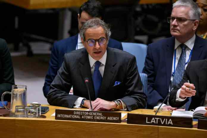 Rafael Mariano Grossi, Director General de la Agencia Internacional de Energía Atómica, informa en la reunión del Consejo de Seguridad sobre la integridad de la central nuclear de Zaporizhzhia en la sede de la ONU en Nueva York el 15 de abril de 2024. (Crédito: Loey Felipe/Foto de las Naciones Unidas)