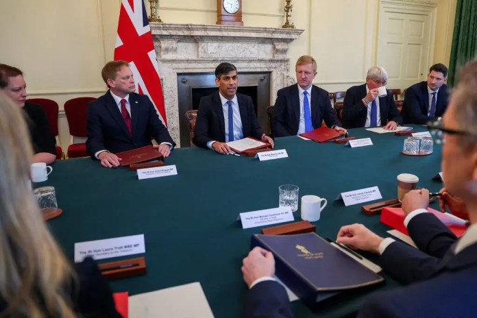 El plan británico para Ruanda se ha convertido en una política emblemática del Primer Ministro Rishi Sunak (centro), en un momento en que los índices de aprobación de su partido han caído.