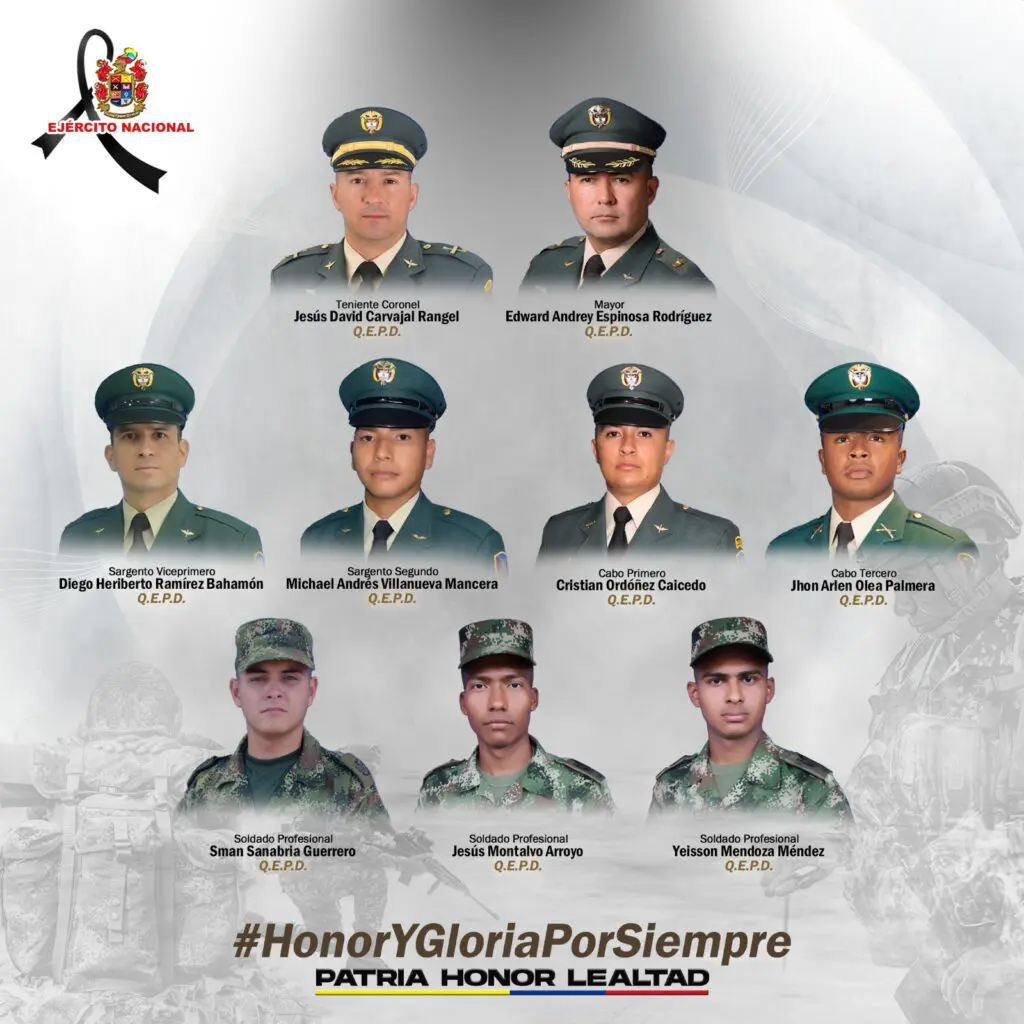 En el lamentable accidente fallecieron el piloto al mando; Teniente Coronel Carvajal Rangel Jesús David; el piloto, Mayor Espinosa Rodríguez Edward Andrey, y la tripulación, Sargento Viceprimero Ramírez Bahamón Diego Heriberto, Sargento Segundo Villanueva Mancera Michael Andrés, Cabo Primero Ordóñez Caicedo Cristián, y los pasajeros, Cabo Tercero Olea Palmera Jhon Arlen y los Soldados Profesionales Sanabria Guerrero Sman, Montalvo Arroyo Jesús y Mendoza Méndez Yeisson.