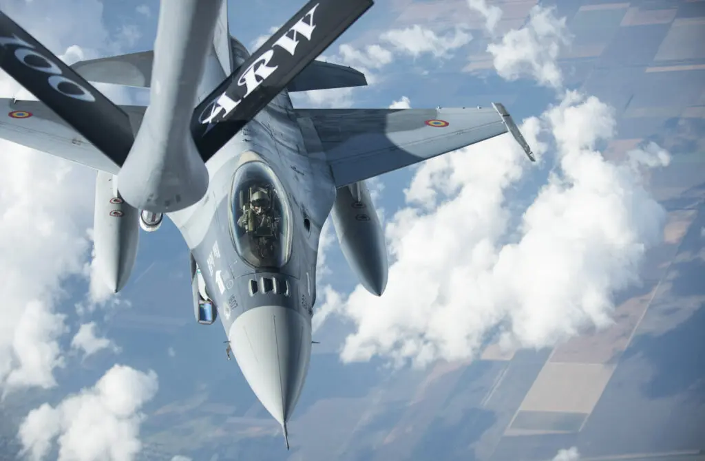 A Romanian Air Force F-16 prepares to receive fuel from a KC-135 Stratotanker from the 100th Air Refueling Wing, RAF Mildenhall, England, over Romania Sept. 13, 2018. Training with NATO allies such as Romania improves interoperability and demonstrates the United States’ commitment to regional security. (U.S. Air Force photo by Tech. Sgt. Emerson Nuñez)