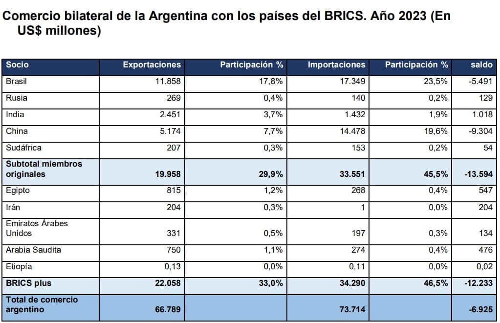 Por otro lado, en la pregunta N°296, se le pidió Posse que indique los argumentos técnicos sobre la no participación de Argentina en los BRICS, siendo una de las preguntas si el país va a mantener el comercio bilateral con algún miembro del foro y la cantidad que representa para el comercio total de Argentina.