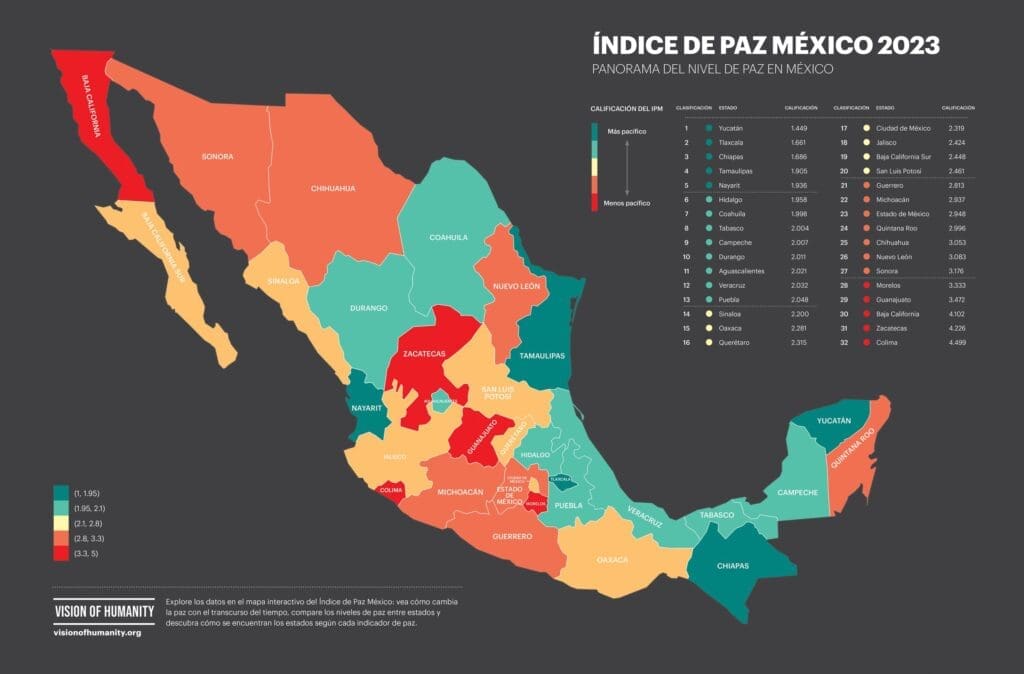 A pesar de una mejora del 1,4% en 2023, el deterioro de la paz en México es del 14,4% desde 2015, con tasas de crimen organizado y homicidios notablemente peores que hace nueve años.