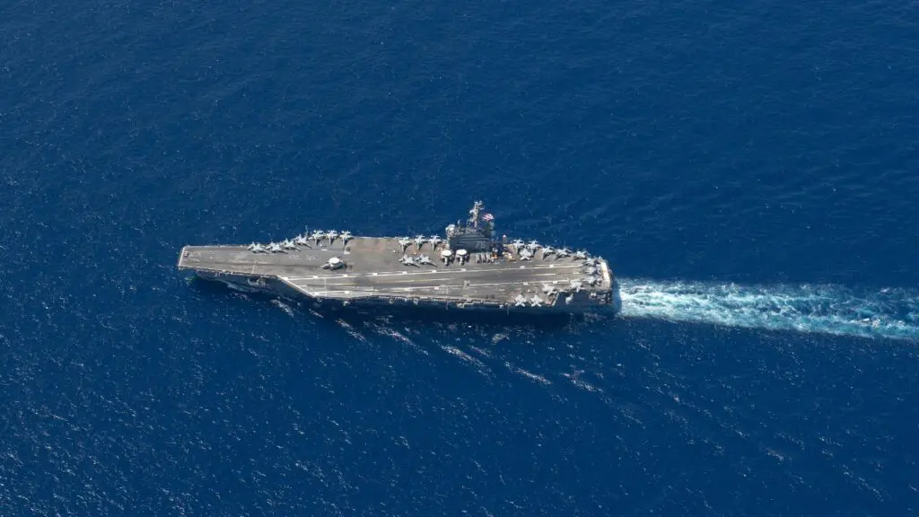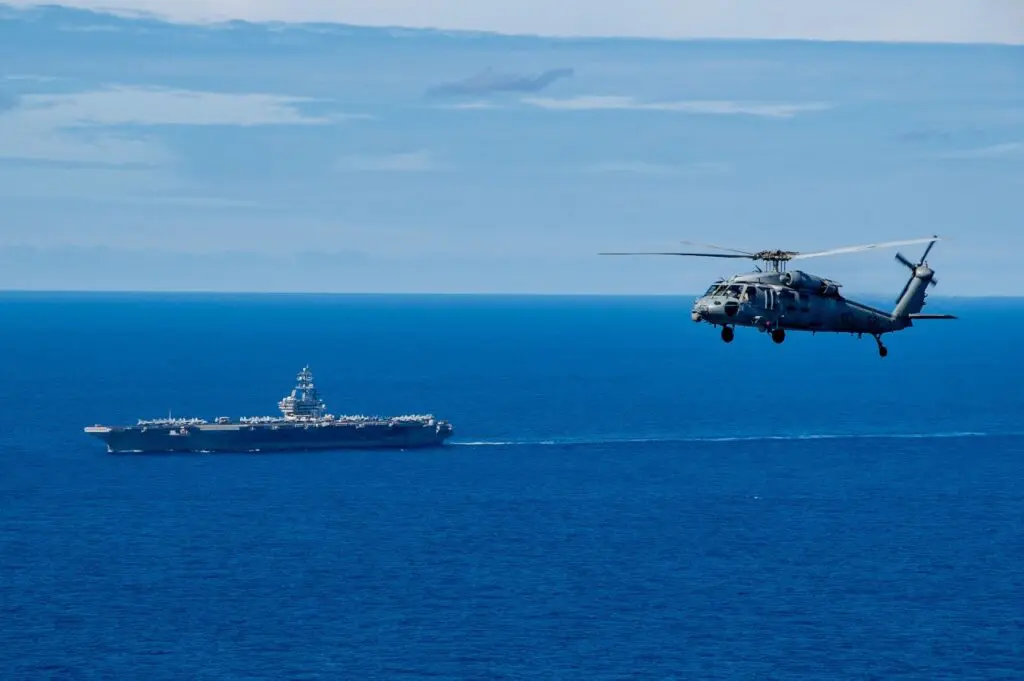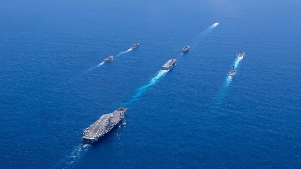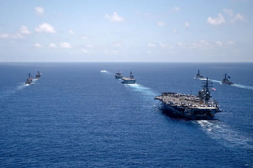 El portaaviones USS Ronald Reagan de la Armada de Estados Unidos perteneciente al Grupo de Ataque 5 de la 7ma Flota se encuentra acompañado del USS Blue Ridge (LCC 19), el crucero de misiles guiados USS Robert Smalls, de clase Ticonderoga, y los destructores de misiles guiados USS Higgins (DDG 76) y USS Rafael Peralta (DDG 115), de clase Arleigh Burke. Cabe recalcar que el portaaviones partió recientemente de la Base Naval Yokosuka, Japón, cómo comienzo de la última patrulla programada del buque en el Indo-Pacífico antes de ser remplazado por el USS George Washington.