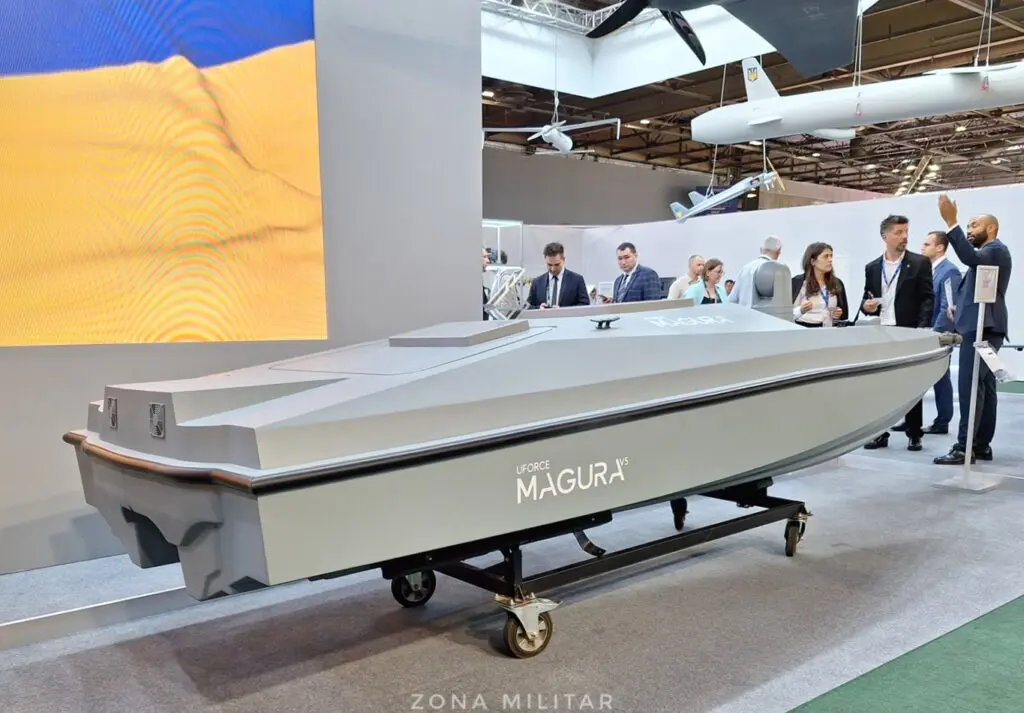 Tras cosechar notables éxitos en el Mar Negro, el vehículo de superficie no tripulado MAGURA V5 es uno de los tantos drones exhibidos por la industria de la defensa de Ucrania presente en Eurosatory 2024.