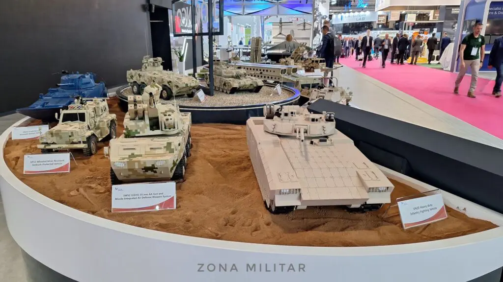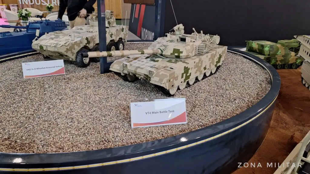 En ese sentido, la empresa del gigante asiático, que hoy en día provee a varios países con sus sistemas, ha llevado las representaciones de la gama de los vehículos terrestres de los que están comercializando en la actualidad. Al respecto fueron exhibidos el Vehiculo de Combate Blindado a Rueda (VCBR) VN1 8×8, como de Combate de Infantería Pesado VN 20, el vehículo 4×4 VP 11 del tipo MRAP, el Vehículo Blindado Anfibio VN 16, y el Tanque de Batalla Principal VT4.
