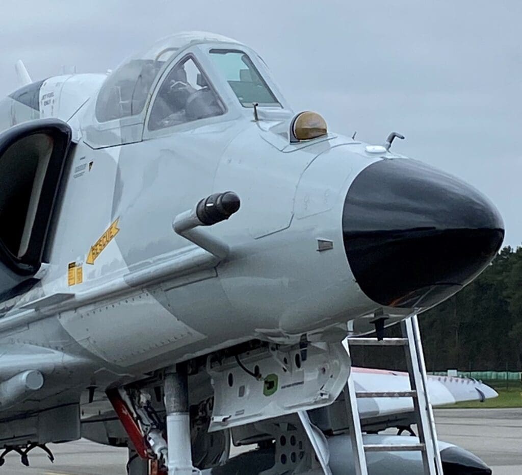 A finales del pasado mes de febrero, Tops Aces confirmó la finalización de diversos trabajos de instalación e integración de nuevos equipos en sus A-4N Skyhawk agresores. Más en detalle, se apreció la presencia de búsqueda y seguimiento por infrarrojos ( IRST ) realizado a través de a través del sistema de misión de agresor avanzado (AAMS) de arquitectura abierta de la compañía canadiense. Además, es preciso destacar que los Skyhawk de Top Aces también se encuentra equipados con un radar AESA, de cual no se brindaron características en cuanto al modelo elegido, especulándose podría ser uno de los modelos ofrecidos por ELTA o Leonardo, mientras que el sistema IRST resulta a simple vista similar al Selex ES IRST.