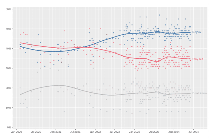 En cuanto a la posibilidad de que el Reino Unido reingrese a la Unión Europea, en Downing Street se sabe que una marcha atrás conlleva un proceso lleno de incertidumbres y negociaciones complicadas. Además, el acuerdo al que se llegaría hoy podría ser diferente y más exigente que el anterior. Parece poco probable que el Reino Unido recorra este camino debido a la oposición del Partido Conservador y a que el líder del partido laborista, hoy nuevo Primer Ministro, Keir Starmer, ha manifestado que no convocará a un nuevo referéndum.