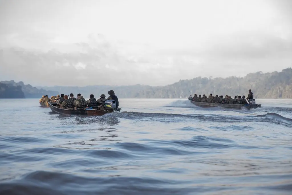 U.S. and Brazilian Army Soldiers move south along the Oyapock River during Exercise Southern Vanguard 24 in Oiapoque, Brazil, on Nov. 12, 2023. Southern Vanguard is an annual exercise at the operational and tactical levels to increase interoperability between U.S and Western Hemisphere forces, in this instance, Brazil. (U.S. Army National Guard photo by Spc. Joseph Liggio)