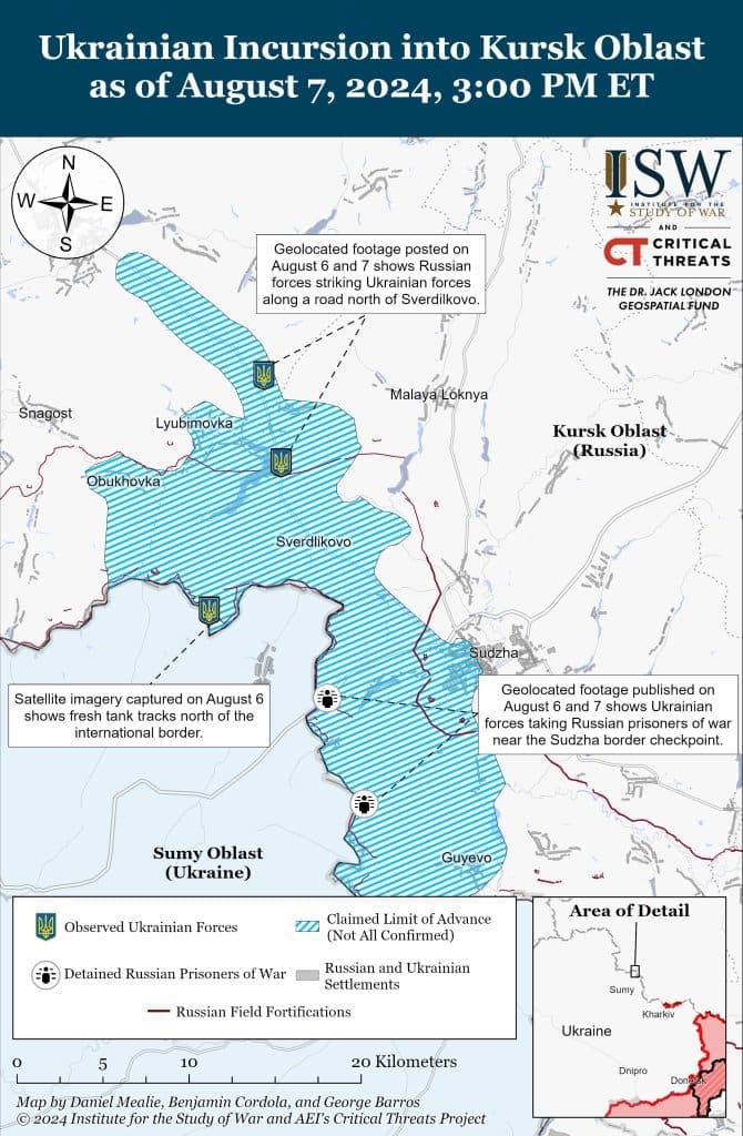 Una fuente interna rusa confirmó a dicho medio, que Ucrania logró tomar control de aproximadamente 45 kilómetros cuadrados desde que lanzaron la operación el 6 de agosto. Adicionalmente, las tropas del Ejército de Ucrania capturaron un total de 11 asentamientos, incluidos Nikolaevo-Daryino, Darino y Sverdlikovo, y están operando activamente en Lyubimovka, creando fuerte presión sobre las defensas rusas en la región.