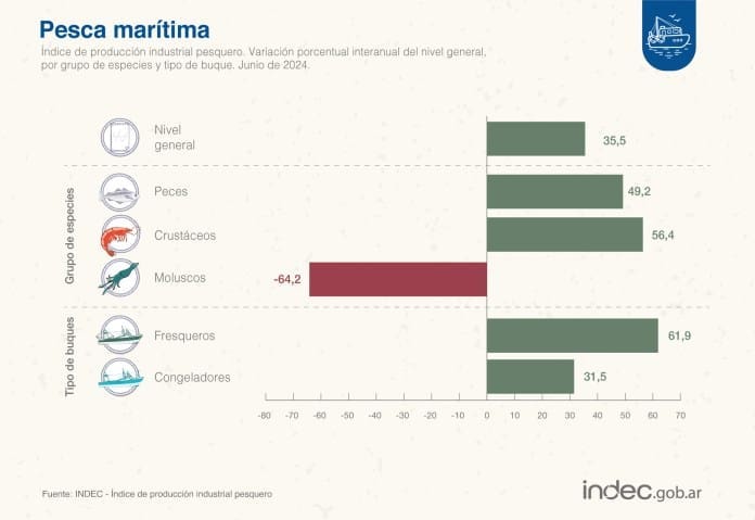 La producción pesquera en Argentina alcanzó un crecimiento significativo en junio de 2024, con un aumento del 35,5% en comparación con el mismo mes del año 2023, según datos publicados por el Instituto Nacional de Estadística y Censos (INDEC). Este incremento destaca un desarrollo positivo de la pesca marítima argentina en lo que va de este corriente año, impulsado por un buen rendimiento en la producción de especies como peces y crustáceos.