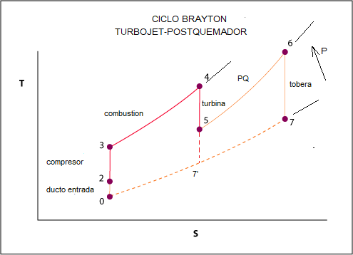 El proceso responde a un ciclo termodinámico de Brayton ideal (Isotrópico) (Temperatura vs Entropía (T – S)), donde las estaciones son 0: flujo libre, 1-2: ducto entrada compresor, 2-3:compresor, 3: salida compresor a cámara combustión, 3-4:cámara combustión, 4: entrada a turbina, 4-5: turbina, 5: salida de turbina, 6: postquemador, 7: tobera. 8: Salida de tobera a presión atmosférica
