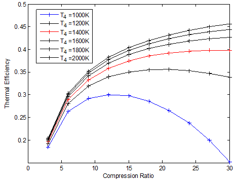 En este diagrama hay dos áreas claves para la performance, que están directamente relacionadas, la eficiencia del compresor P2 a P3, que define la relación de compresor Rc, y la máxima temperatura alcanzada en T4. La T4 está limitada por el material de la turbina, y limita a su vez la energía posible de transferir al compresor. A medida que se mejoran los materiales, puede subir T4 y también Rc.