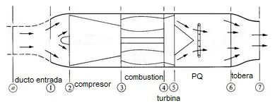 Sintéticamente, el flujo de aire libre (0) enfrenta el ducto de entrada (1), que reduce la velocidad y aumenta la Presión y temperatura de flujo de aire a la entrada del compresor (2). El compresor entrega energía al flujo, aumentando presión y temperatura hasta la entrada de la cámara de combustión (3). En la cámara de combustión se agrega energía, incrementando Temperatura a Presión constante entre 3 y 4. El flujo caliente pasa por la turbina, generando la misma energía que requiere el compresor, perdiendo temperatura y presión de (4) a (5), y entrando en la tobera, cuando se agrega energía nuevamente en el postquemador hasta (6), luego incrementado velocidad en la tobera (7) hasta igualar presión con P0 en condicionesde flujo libre. En caso de un motor sin postquemador, se incrementa velocidad perdiendo temperatura hasta la salida de la tobera (7’) hasta igualar presión con P0 en condicionesde flujo libre. En el diagrama, el área bajo la curva es proporcional al empuje obtenido.