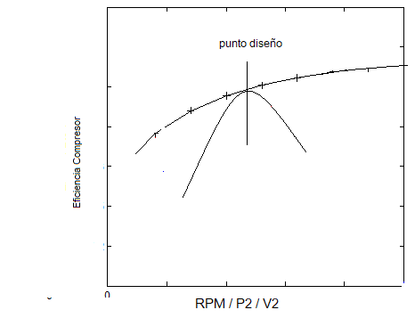 Ahora, para una Rc determinada, las condiciones de P, T y V en (2) deben ser muy específicas sino el compresor pierde eficiencia, definiéndose un punto de sintonía y un rango de eficiencia decreciente alrededor de este. Ahora, para una Rc determinada, las condiciones de Presión, Temperatura y Velocidad en la entrada del compresor deben ser muy específicas sino el compresor pierde eficiencia, definiéndose un punto de sintonía y un rango de eficiencia decreciente alrededor de este.