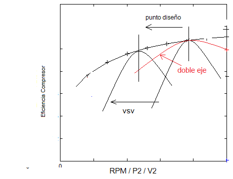 En fig 19 se presenta esquemáticamente la diferencia conceptual de efecto de cada uno de estos sistemas. El doble eje amplia la curva de eficiencia sobre el punto de diseño, y el VSV corre la curva a otro punto de diseño.
