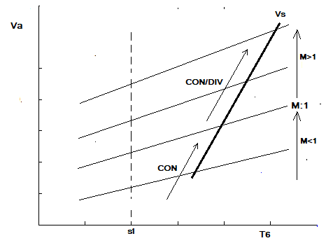 Las toberas solo convergentes, son aptas para vuelo supersónico en el rango de M:1.2 a 1.5, en aviones diseñados para una rápida aceleración y corto tiempo a esa velocidad. Esta tobera solo permite alcanzar M:1 del flujo del postquemador al fin de la tobera, expandiéndose después a presión atmosférica. Para un motor previsto para velocidades sostenidas entre M1.5 y M2+ es necesario contar con tobera convergente-divergente (CON/DIV) que permite que el flujo siga acelerándose más allá de M:1 en la garganta de la tobera. A mayor Temperatura, la velocidad Va de Mach es mayor, por lo que la velocidad VS del flujo de descarga llega a ser mayor que la velocidad del avión pese a que el M sea menor, por lo que a mayor temperatura del flujo se puede conseguir mayor velocidad a la salida de la tobera Vflujo> Vvuelo y mantener empuje hasta la velocidad de diseño). Acá esta una de las claves, cuanta más temperatura se obtenga, tanto en T4, como en T6, mas empuje supersónico se logra. Si se grafica V Salida como función de T6, se tiene.
