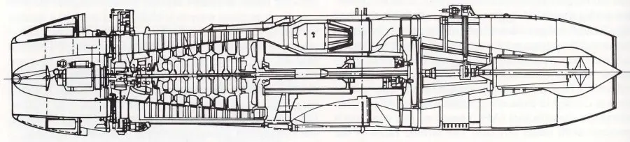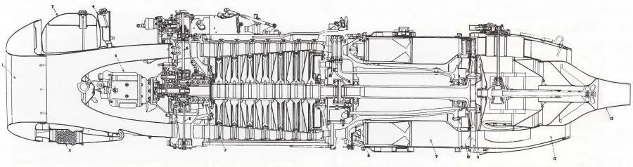 La configuración era bastante simple y básica, 17 etapas de compresor, cámaras de combustión tubulares y tres ruedas de turbina sobre un único eje. Era una evolución del J47, pero con las innovaciones de VIV y VSV en las primeras 6 etapas, PQ y con la innovación de la tobera de geometría variables convergente divergente.