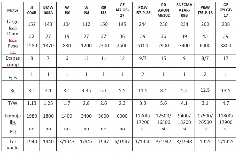 Para entender el salto de tecnología del J79 es conveniente hacer un pequeño resumen de cómo se llega al desarrollo de los motores a reacción al inicio del diseño de este. Los primeros motores fueron los diseños de Whittle en Inglaterra y de Hans Von Ohain en Alemania antes de 1939, ambos de compresor centrifugo que eran muy básicos, solo una prueba de concepto. Aunque el 1A de Whittle derivo en varios modelos operativos, Rolls Royce Derwent, RR Nene, RR Ghost, tanto los alemanes como los EEUU apuntaron al desarrollo del compresor axial, más eficiente y apto para evolucionar a mayores caudales y empujes. Este artículo se restringe a la evolución del compresor axial. En Tabla 1 se presentan las características básicas de varios de los motores mencionados en el artículo.