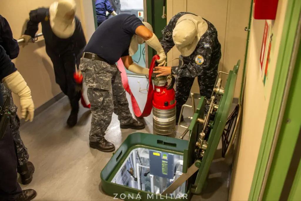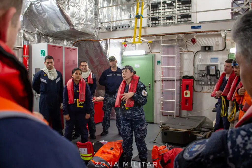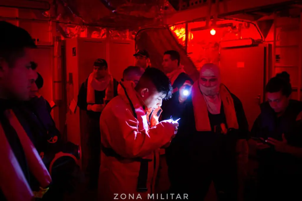 Obedeciendo al protocolo establecido, toda la tripulación disponible inició inmediatamente las maniobras de evacuación. Esto implica trasladarse hasta el punto de reunión, en este caso el hangar (en caso real sería la cubierta de vuelo), donde cada persona a bordo tiene una balsa designada. En el desarrollo de esta maniobra se va llevando el conteo del personal, el cual arriba con su bolso de desembarco, salvavidas y traje anti-exposición.