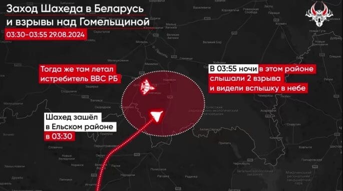Según analistas, un dron de ataque Shahed ruso voló sobre el territorio de Bielorrusia, en el distrito de Yelsk. Allí, luego de ingresar al espacio aéreo de Bielorrusia, un caza de la Fuerza Aérea persiguió al dron durante unos 20 minutos. A las 03:55 se escucharon al menos 2 explosiones y se observó un destello brillante en el cielo.