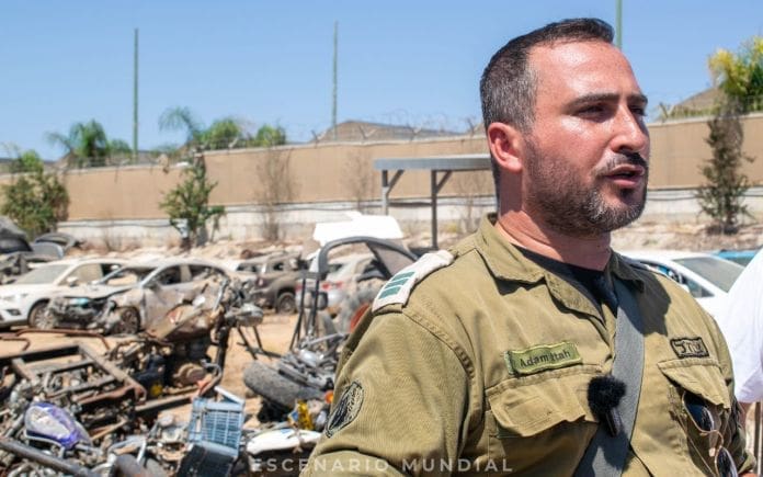 Durante nuestra visita a Tkuma, nos encontramos con un vasto estacionamiento lleno de autos destruidos, quemados y abandonados. Adam Ittah, capitán portavoz del DFI y miembro de la unidad de rescate del Ejército de Israel, nos explicó el contexto de esta devastadora escena.