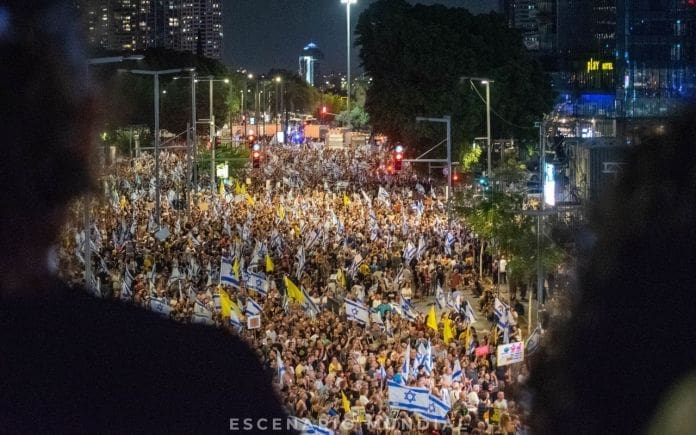 La manifestación central tuvo lugar en la calle Begin de Tel Aviv, donde decenas de miles de personas marcharon sumándose a una protesta masiva. Al mismo tiempo, ciudades como Haifa, Jerusalén, Herzliya, Cesarea, Be’er Sheva y decenas de localidades en todo Israel fueron escenario de concentraciones similares.