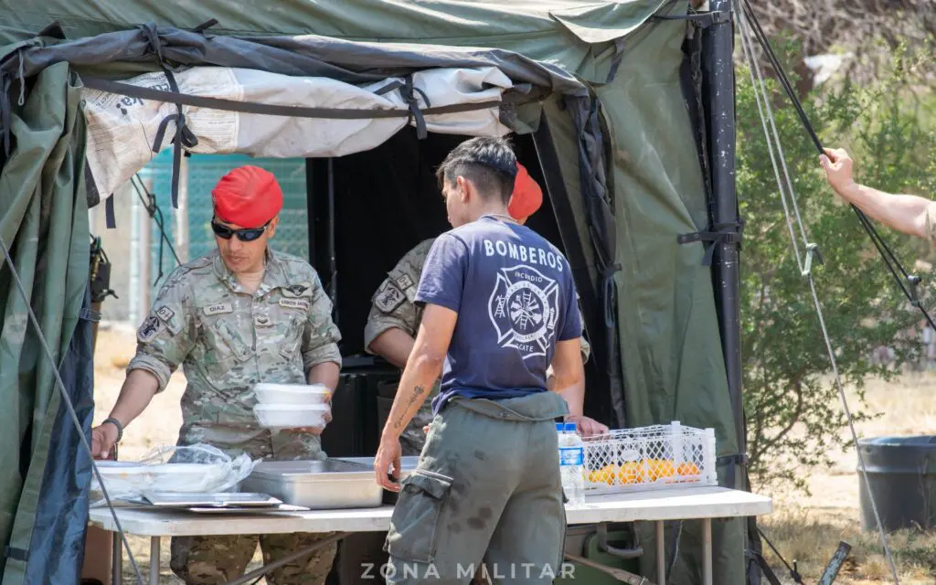 Otro punto importante es la asignación de Zonas de Espera, donde se nuclean todos los recursos, desde donde se concentran los recursos necesarios para todo el personal desplegado. Otro aporte de la fuerza va de la mano del despliegue de una cocina de campaña, un depósito, un comedor y una habitación con el objetivo de prestar soporte al personal que incansablemente combate las llamas.