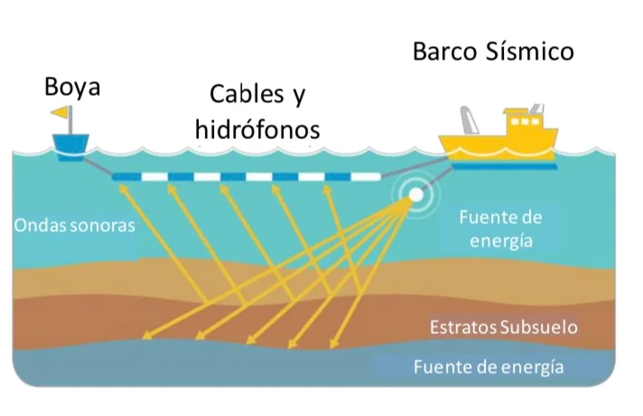 Durante el proceso, se libera rápidamente una cámara de aire comprimido en el agua para crear un pulso acústico. Las ondas de sonido generadas se reflejan y refractan en las capas subterráneas cuando encuentran variaciones en las propiedades físicas (estratos geológicos, gas, petróleo, etc.), y regresan a la superficie, donde son captadas por hidrófonos ubicados dentro de un sistema de cables sísmicos, conocidos como streamers.