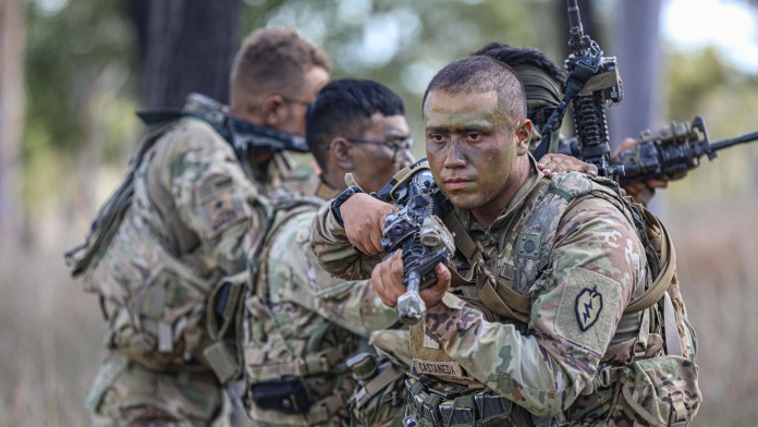 Para probar la capacidad del Ejército de desplegarse rápidamente y combatir en las islas del Pacífico, los soldados de la 25ª División de Infantería, junto con fuerzas japonesas, australianas, indonesias y de otros aliados, descendieron en rápel por barrancos selváticos y luego ascendieron con equipo pesado en medio del terreno húmedo.