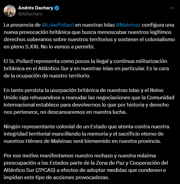 Esto generó rápidamente la reacción argentina en manos del Secretario de Malvinas, Antártida, Islas del Atlántico Sur y Asuntos Internacionales de la provincia de Tierra del Fuego, Andrés Dachary. A través de la misma red social, Dachary respondió que la presencia de Pollard en las Islas “configura una nueva provocación británica”, que menoscaba los legítimos derechos soberanos de la Argentina y sostiene el colonialismo en pleno siglo XXI.