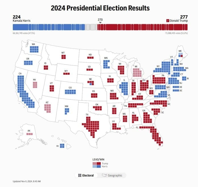 La victoria de Trump se confirmó cuando logró más de los 270 votos electorales requeridos, superando a la candidata demócrata Kamala Harris, quien asumió la candidatura tras el retiro del presidente Joe Biden de la contienda electoral. Con el estado de Wisconsin otorgándole el número decisivo de votos, Trump consolidó su regreso al poder, aventajando a Harris por 5 millones de votos en el conteo popular y asegurando una mayoría en el Colegio Electoral, con una proyección de 279 votos a su favor, frente a los 223 obtenidos por Harris.