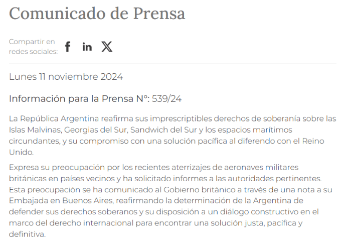 A grandes rasgos, el comunicado oficial hace hincapié en que “la República Argentina reafirma sus imprescriptibles derechos de soberanía sobre las Islas Malvinas, Georgias del Sur, Sandwich del Sur y los espacios marítimos circundantes, y su compromiso con una solución pacífica al diferendo con el Reino Unido”. Asimismo, reafirma “la determinación de la Argentina de defender sus derechos soberanos y su disposición a un diálogo constructivo en el marco del derecho internacional para encontrar una solución justa, pacífica y definitiva”.