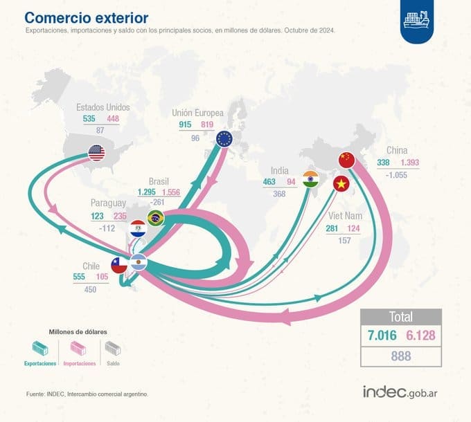 Según informaron desde el INDEC, la balanza comercial argentina alcanzó un superávit de USD 888 millones en el mes de octubre, evidenciando una notable recuperación en comparación con el déficit de USD 454 millones registrado en el mismo mes del año anterior.