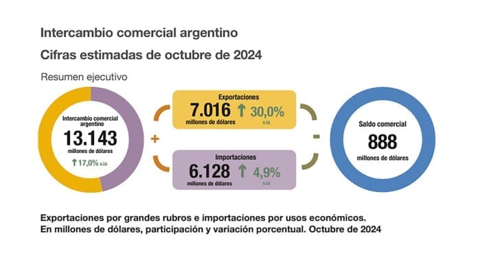 Respecto a las importaciones, se alcanzó un total de USD 6.128 millones, un 4,9% más en comparación con octubre de 2023. Según el INDEC, este incremento se explica por un aumento del 5,0% en los volúmenes importados y del 0,3% en los precios.