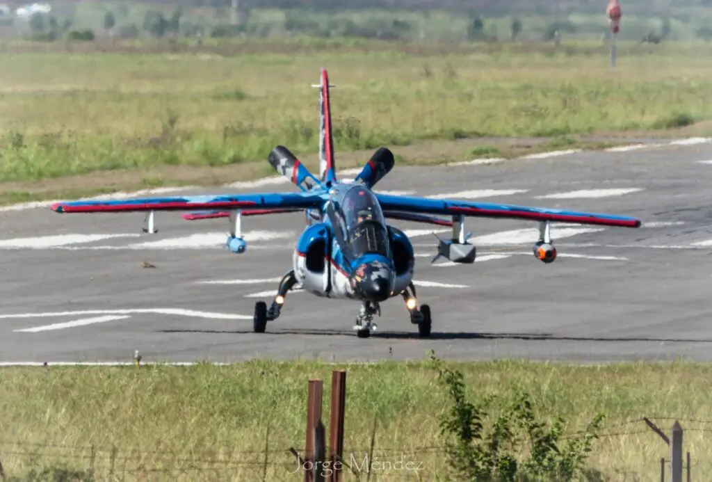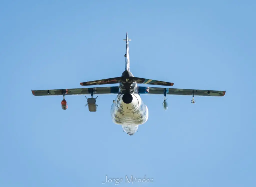 Gracias a una serie de imágenes capturadas por el fotógrafo Jorge Méndez, se pudo apreciar al IA-63 Pampa III B2 EX-03 del Centro de Ensayos en Vuelo de la Fuerza Aérea Argentina portando lo que sería una bomba guiada stand-off inerte de la serie Dardo.