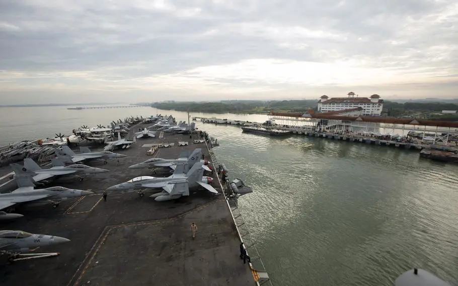 Previó a su llegada al Mar del Sur de China, el USS Abraham Lincoln (CVN-72) se detuvo en Malasia, siendo la primera visita de este portaaviones al país desde el arresto en 2013. Luego, el 27 de noviembre, el portaaviones se unió en el estrecho de Singapur a sus escoltas: los destructores USS Spruance (DDG-111) y USS Michael Murphy (DDG-112), que habían estado en Phuket, Tailandia, y el USS Frank E. Petersen Jr. (DDG-121), que estaba en Singapur.