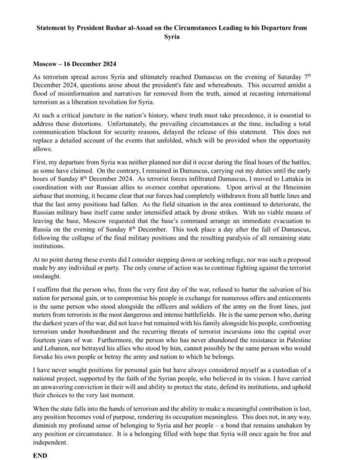 Primeras declaraciones de Bashar al-Assad tras su salida de Siria