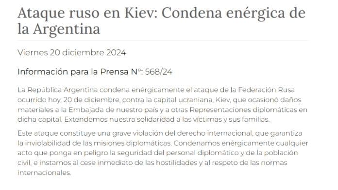“La República Argentina condena enérgicamente el ataque de la Federación Rusa ocurrido hoy, 20 de diciembre, contra la capital ucraniana, Kiev, que ocasionó daños materiales a la Embajada de nuestro país y a otras Representaciones diplomáticas en dicha capital. Extendemos nuestra solidaridad a las víctimas y sus familias”, reza el comunicado oficial.