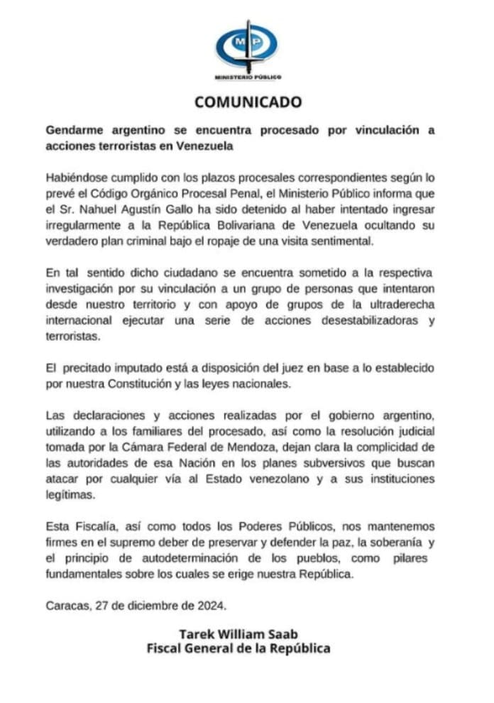El comunicado del Ministerio Público, posteado en redes sociales como Instagram, afirma que Gallo “ha sido detenido al haber intentado ingresar irregularmente a la República Bolivariana de Venezuela ocultando su verdadero plan criminal bajo el ropaje de una visita sentimental”. El procesamiento del gendarme, por “vinculación a acciones terroristas en Venezuela”, ocurre luego de haberse cumplido con los plazos procesales correspondientes según el Código Orgánico Procesal Penal del país.