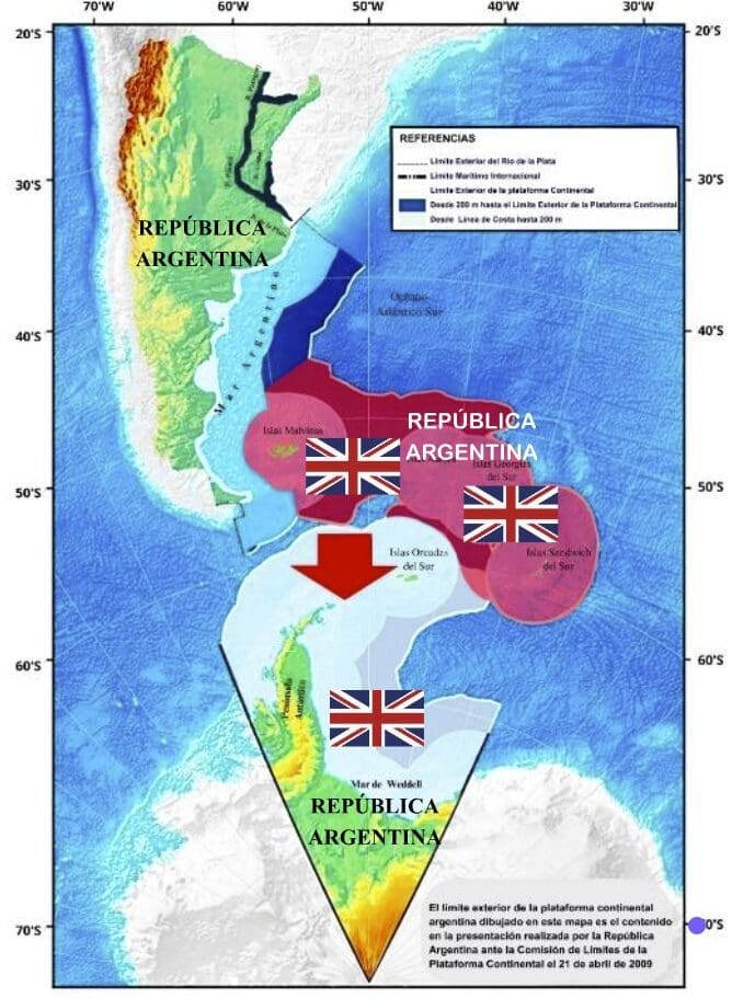 Por si 2.600.000 km2 fueran poco (vale recordar que Argentina desde La Quiaca hasta Ushuaia suma casi 2.800.000 km2), dicha invasión da lugar a la pretensión de la Corona Británica y su Reino Unido de Gran Bretaña e Irlanda del Norte sobre el 75 % de los 5.500.000 km2 de la soberanía antártica a la que aspira entre los 20° y 80° de longitud Oeste y al Sur del paralelo 60° Sur, superponiéndose completamente con los 4.600.000 km2 del Sector Antártico Argentino (entre los 25° y 74° de long. Oeste).
