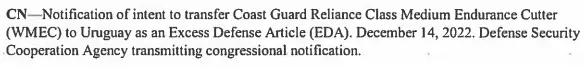 Conforme al reporte de diciembre, emitido por el Comité de Asuntos Exteriores de la Cámara de Representantes de EE.UU., la Agencia de Cooperación para la Seguridad de la Defensa notificó la intención de transferencia de un cúter de alcance medio de la clase Reliance a Uruguay. Tal como se mencionó, la propuesta se realiza a través del programa Excess Defense Article.