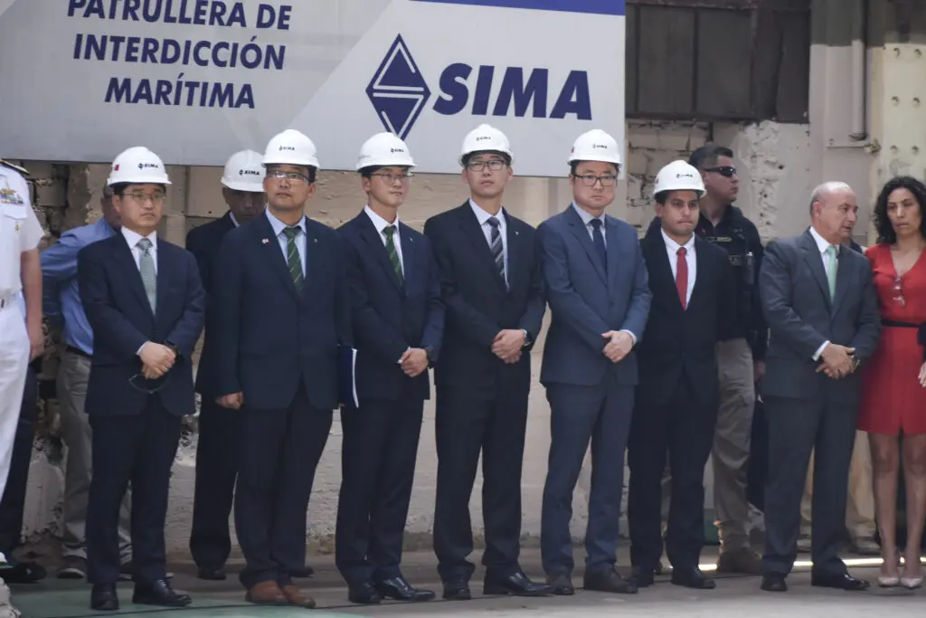 La Presidenta de la República, Dina Boluarte Zegarra, junto al Ministro de Defensa, Walter Astudillo Chávez; el Comandante General de la Marina, Almirante Luis José Polar Figari; el Jefe del Estado Mayor General de la Marina y Presidente del Directorio del SIMA Perú, Vicealmirante César Ernesto Colunge Pinto; y altos representantes de HD Hyundai Heavy Industries en el Perú, estuvieron presentes en el acto.